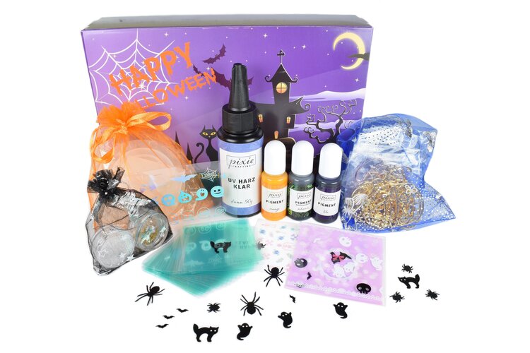 Ob du nun nachleuchtende Accessoires für ein Kostüm oder stimmungsvolle Tischdekoration für dein Party basteln willst, die Halloween Box ist genau das Richtige für dich. Mit passenden Silikonformen, Lünetten und viel tollem Zubehör kann die Halloween Bastelei beginnen!